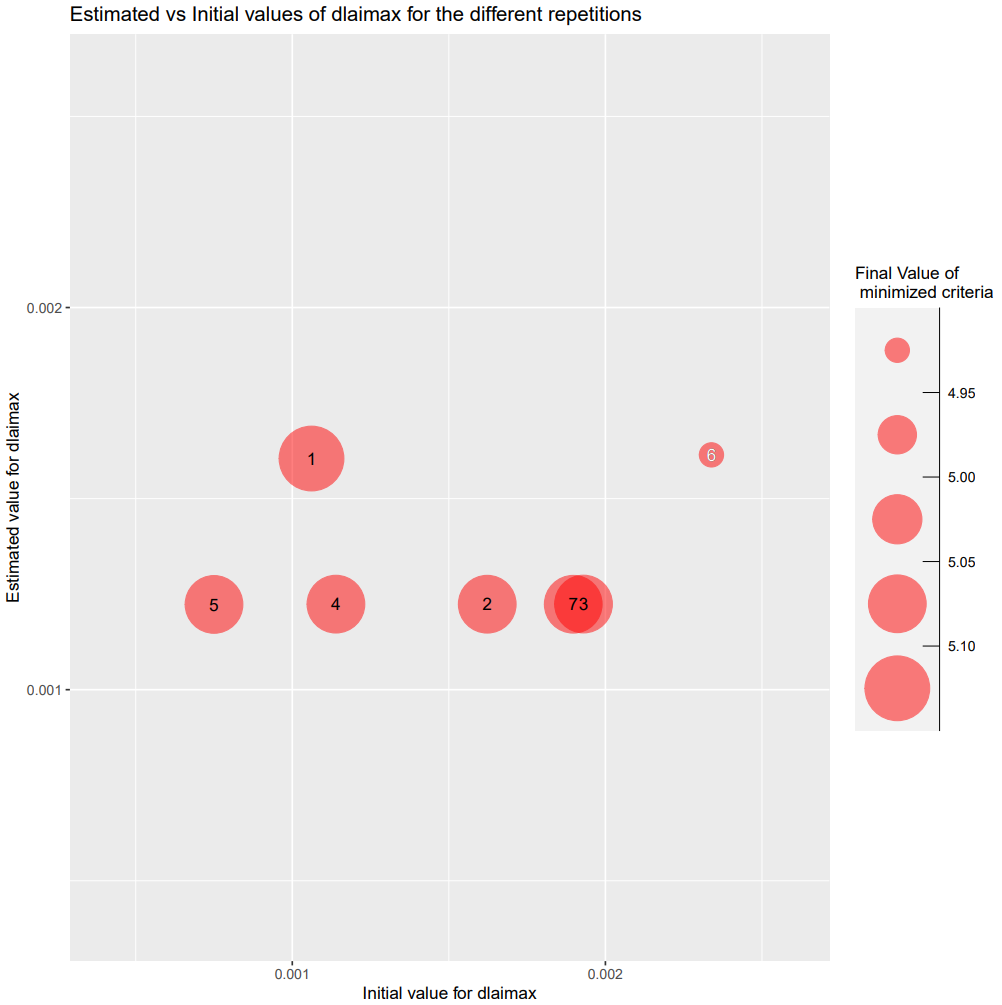 Figure 1: plots of estimated vs initial values of parameters dlaimax and durvieF. Numbers represent the repetition number of the minimization and the size of the bubbles the final value of the minimized criterion. The number in white, 6 in this case, is the minimization that leads to the minimal value of the criterion among all repetitions. In this case, the minimizations converge towards different values for the parameters, which indicates the presence of local minima. Values of durvieF are close to the bounds. In realistic calibration cases with many observed situations / variables / dates this may indicate the presence of biases in the observation values or in the model output values simulated (this simple case with only one situation does not allow to derive such conclusion).
