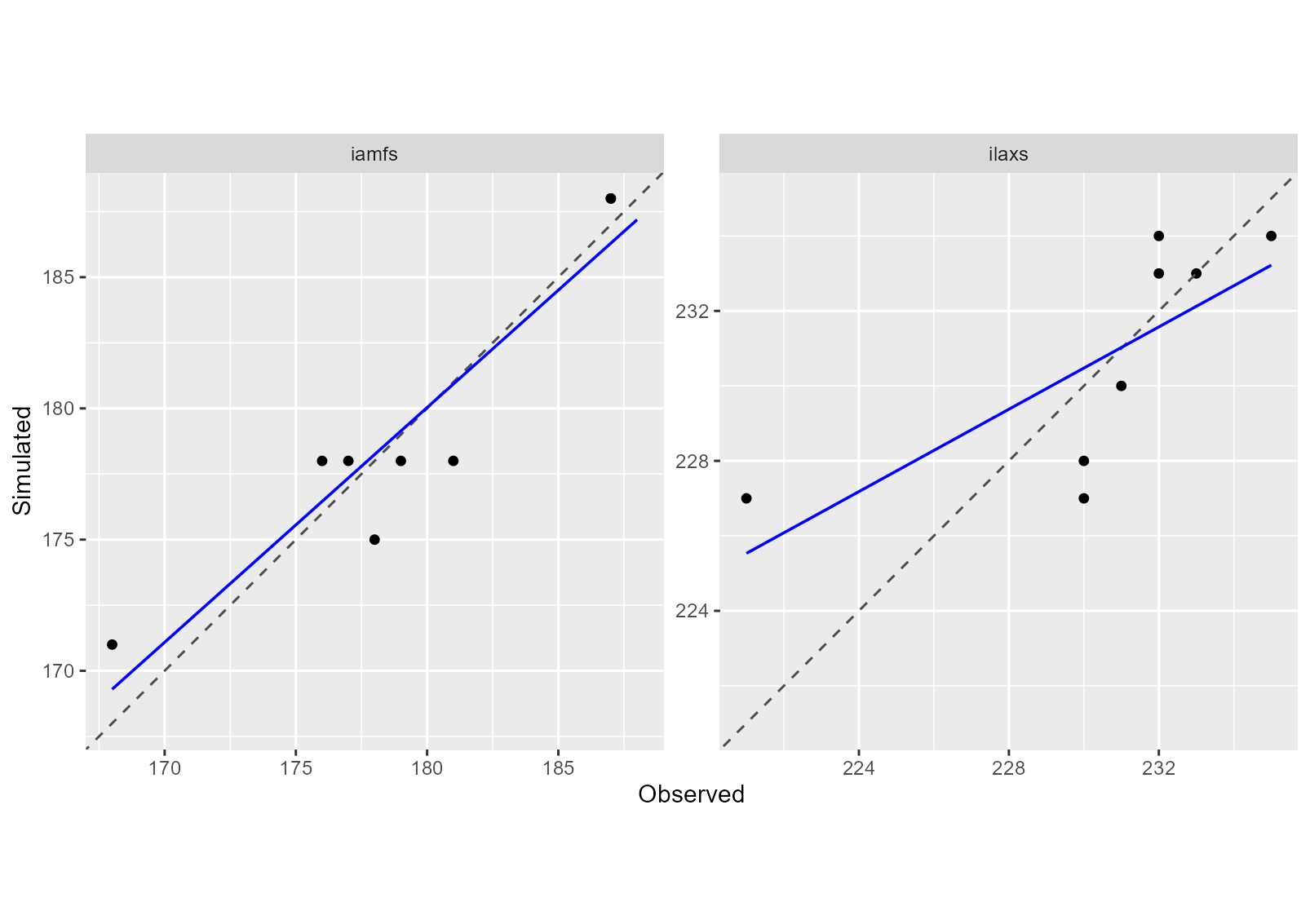 In particular, scatter plots of simulated versus observed values can be produced as follows: